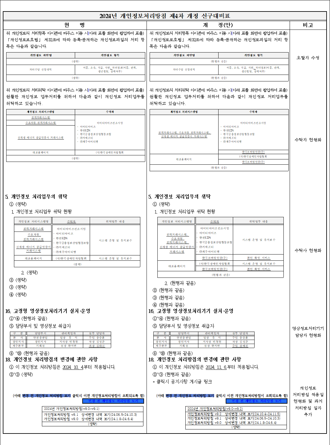 개인정보 처리방침 개정 안내(2024.11.6.) 작성일2024/11/05 14:55 작성자최정은 조회수7,984 연락처-- 2024년 11월 6일부터 개인정보 처리방침이 아래와 같이 개정 됩니다.■ 주요 개정 내용 - 개인정보 업무처리 위탁업체 현행화 - 고정형 영상정보처리기기 담당자 현행화■ 항목별 세부 변경사항■ 시행일- 2024년 11월 6일■ 관련문의- 담당부서: 정보보안실- 전화: 061-330-8376전력거래소는 개인정보를 소중히 처리하고 있으며 보다 안전하게 보호할 것을 약속드립니다.감사합니다. 첨부파일 개인정보처리방침 제4차 개정 신구대비표.png (97.72KB / 다운로드 323회) 다운로드
