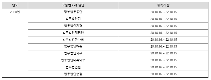 2020년 고문변호사 및 법률 자문현황 작성일2022/11/03 10:10 작성자홍기훈 조회수1,087 고문변호사 : 58건고문변호사 외 : 1건 - 이지○ : 1건별첨 1 2020년 고문변호사 명단 첨부파일 (전력거래소) 2020년 고문변호사 명단.png (16.8KB / 다운로드 341회) 다운로드