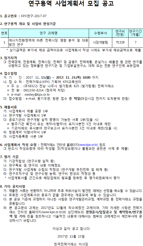 2017년도 제7차 연구용역 사업계획서 모집 공고