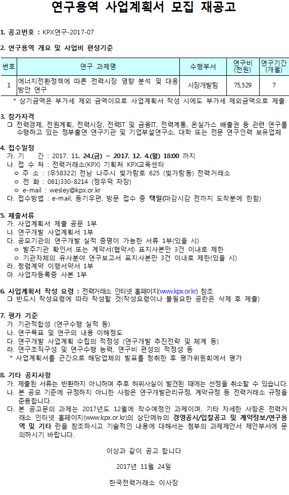 2017년도 제7차 연구용역 사업계획서 모집 재공고