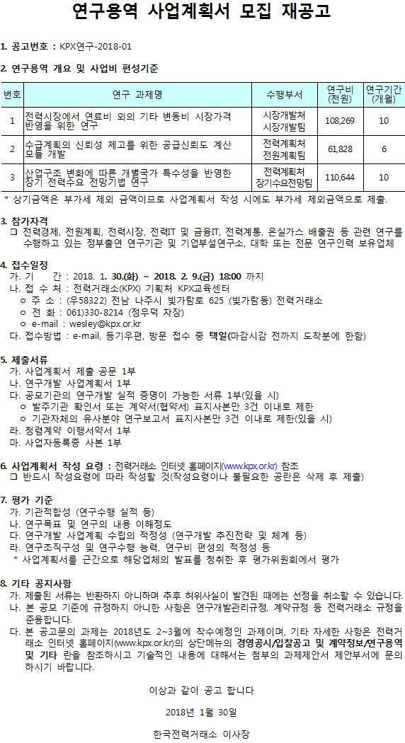 2018년도 제1차 연구용역 사업계획서 모집 재공고