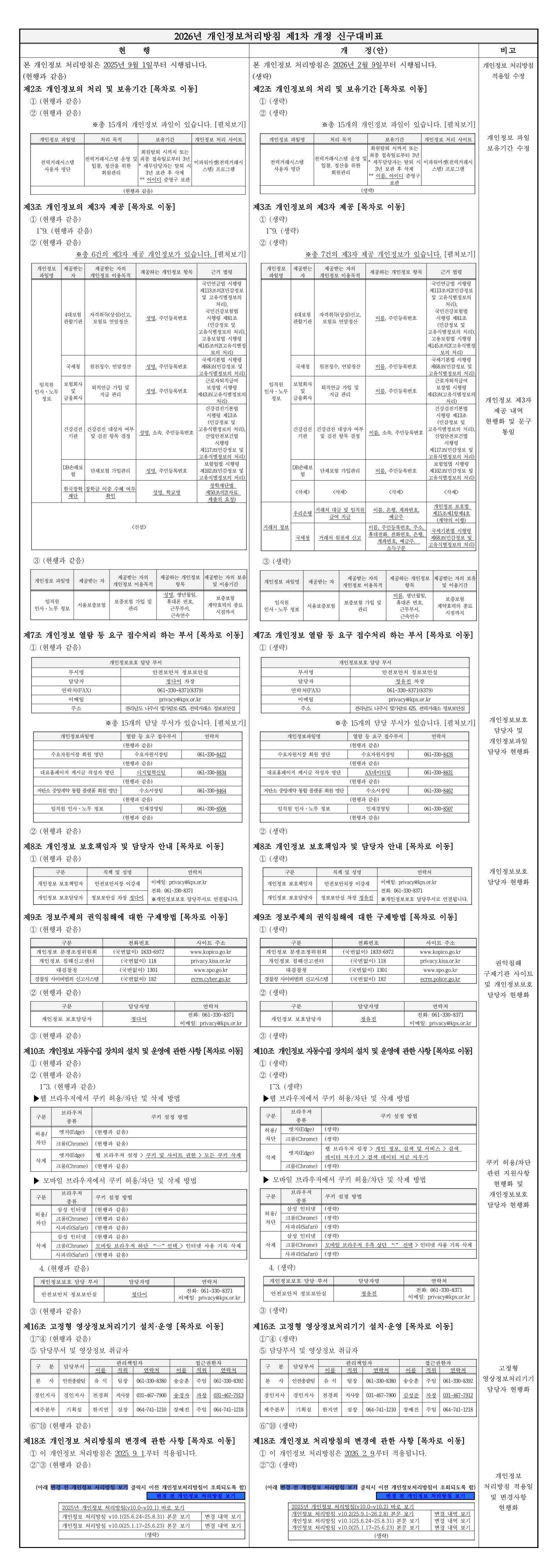개인정보 처리방침 개정 안내(2026.2.9.) 작성일2026/02/05 15:23 작성자정보보안실 조회수439 연락처061-330-8372 2026년 2월 9일부터 개인정보 처리방침이 아래와 같이 개정 됩니다.■ 주요 개정 내용 - 정기 인사이동에 따른 담당자 현행화 - 개인정보 제3자 제공현황 현행화 - 개인정보 처리업무 수탁자 현행화■ 항목별 세부변경사항 신구대비표■ 시행일 - 2026년 2월 9일■ 관련문의 - 담당부서: 정보보안실 - 전화: 061-330-8379전력거래소는 개인정보를 소중히 처리하고 있으며 보다 안전하게 보호할 것을 약속드립니다.감사합니다. 첨부파일 2026년 개인정보 처리방침 제1차 개정 신구대비표.jpg (1.83MB / 다운로드 48회) 다운로드